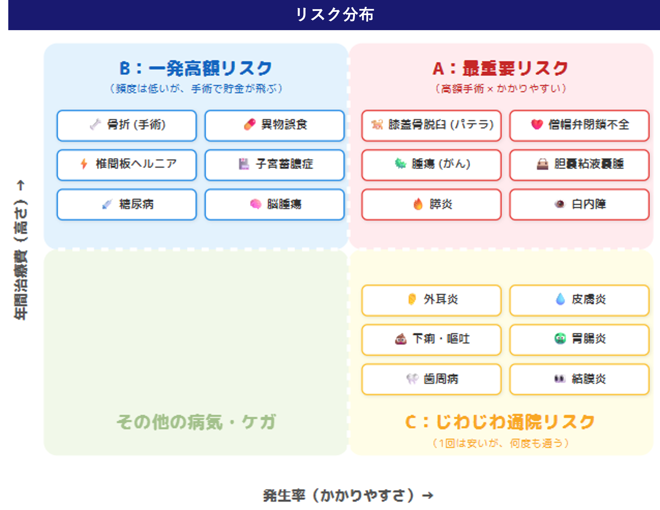 Aエリア:保険必須!「高額治療費」×「高頻度」の最重要リスク