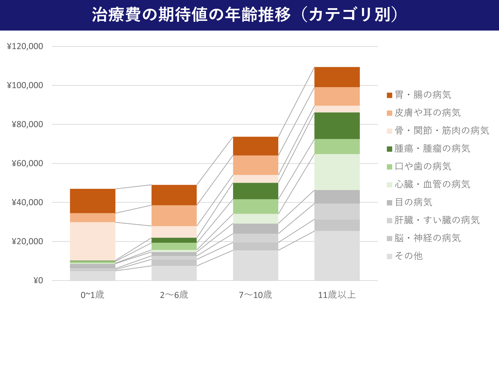 【年齢別推移】シニアになると「治療費の期待値(年間リスク)」はどう跳ね上がる?(カテゴリ別積み上げグラフ)
